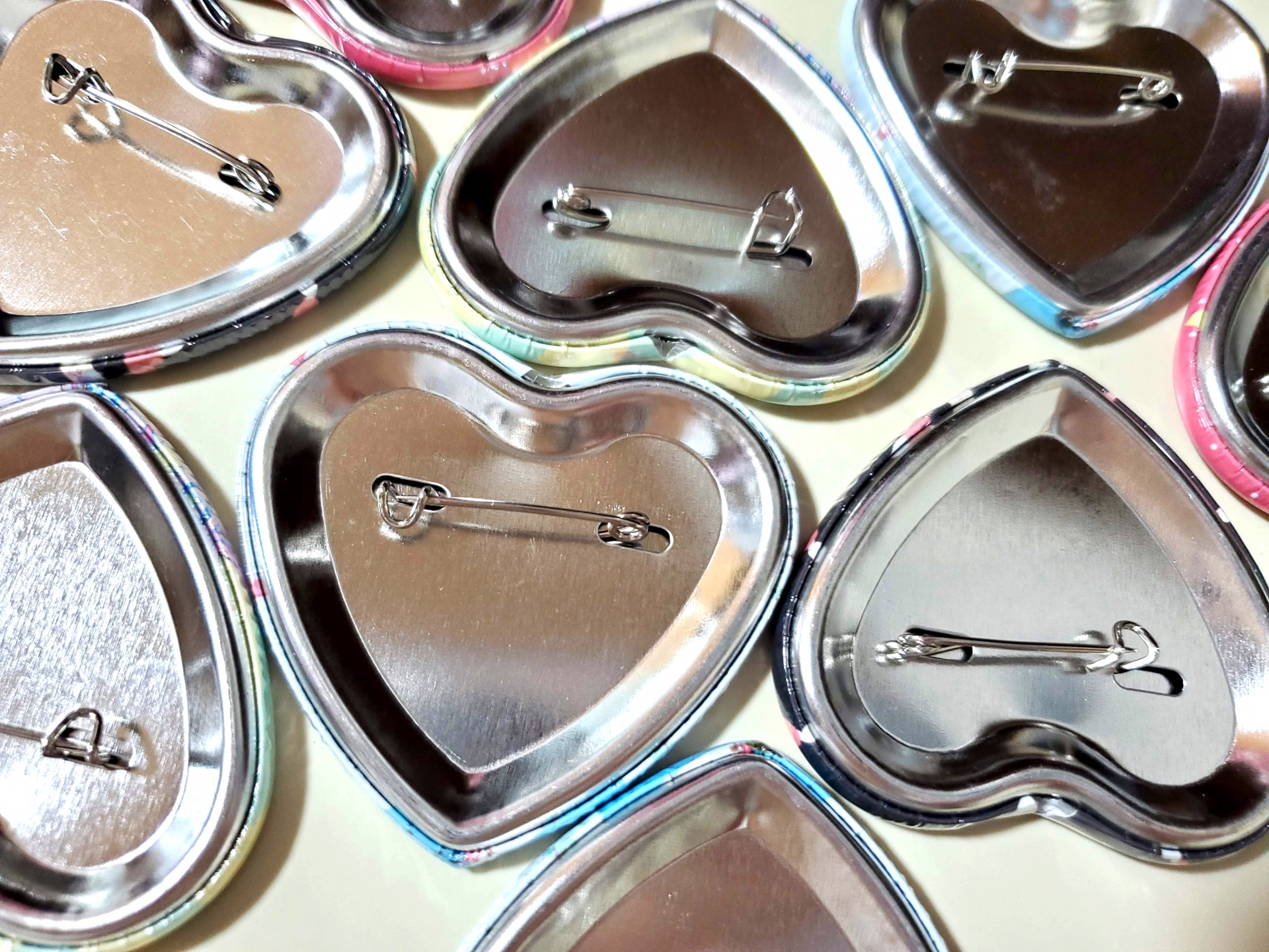 形にもこだわりたい方にオススメ、かわいいハート型の缶バッジ。